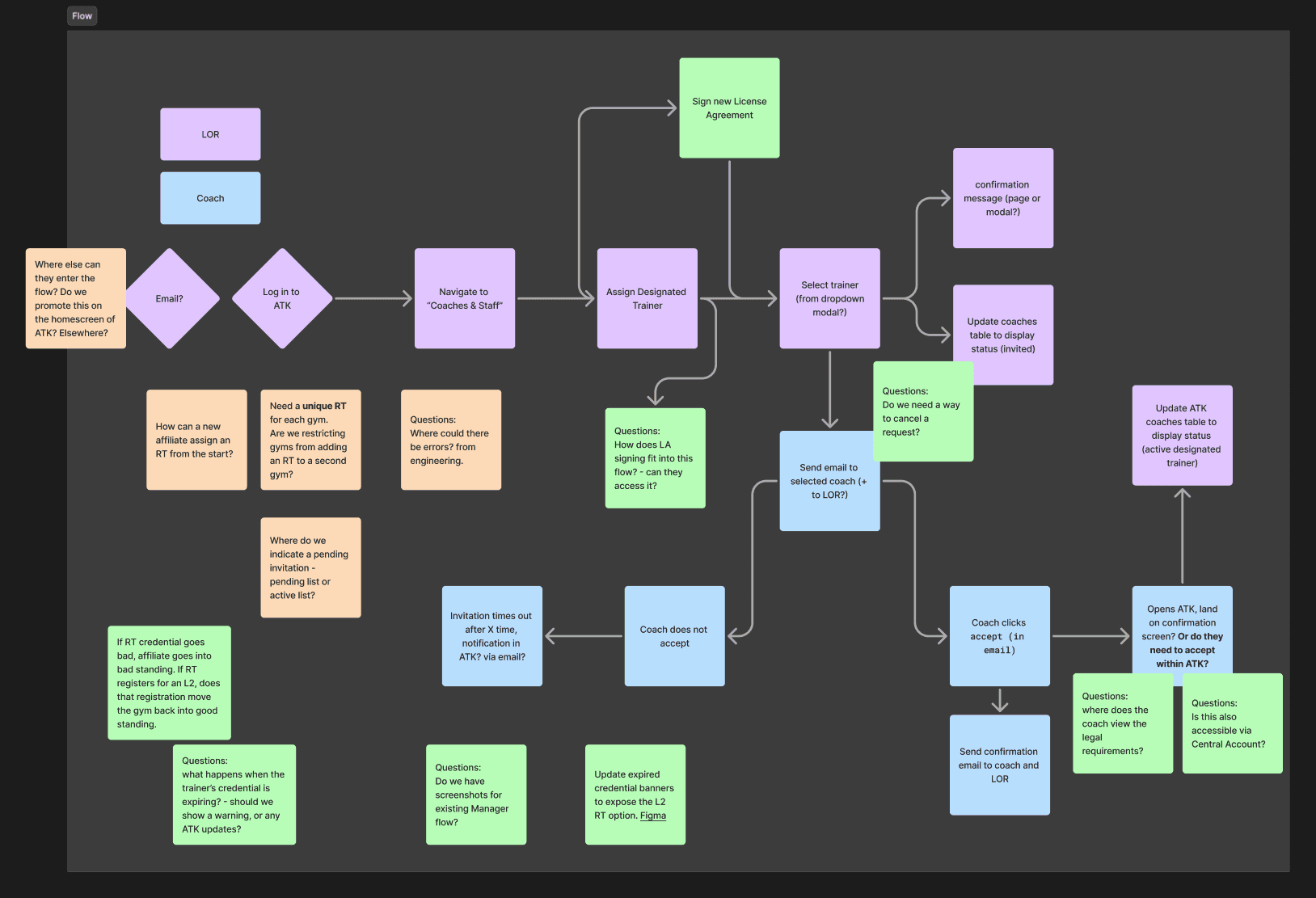 Before designing anything, I needed to map the full picture. Through stakeholder interviews and a thorough audit of existing flows, I uncovered a web of interdependencies — multiple actor types (gym owners, trainers, and CrossFit itself), strict eligibility rules, and legal constraints around licensing agreements that couldn't be ignored.